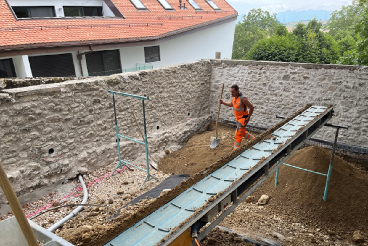 Travaux de terrassement et maçonnerie pour le renforcement des murs de soutènement du jardin de la cure de Gimel. Réalisation d’un soutènement en terre armée à l’arrière de deux murs en maçonnerie de pierre naturelle.