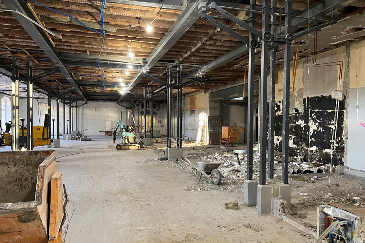 Travaux de démolition des cloisons existantes, d’enlèvement de revêtement de sol et de murs, de faux-plafonds, adaptations de divers murs existants, adaptation ponctuelle de dalles et murs en fonction des exigences de compartimentage feu. Adaptation du hall du rez pour la création d’un escalier de quelques marches et d’une plate-forme élévatrice. Adaptation de canalisations aux nouveaux points de chute des colonnes d’eau usées.