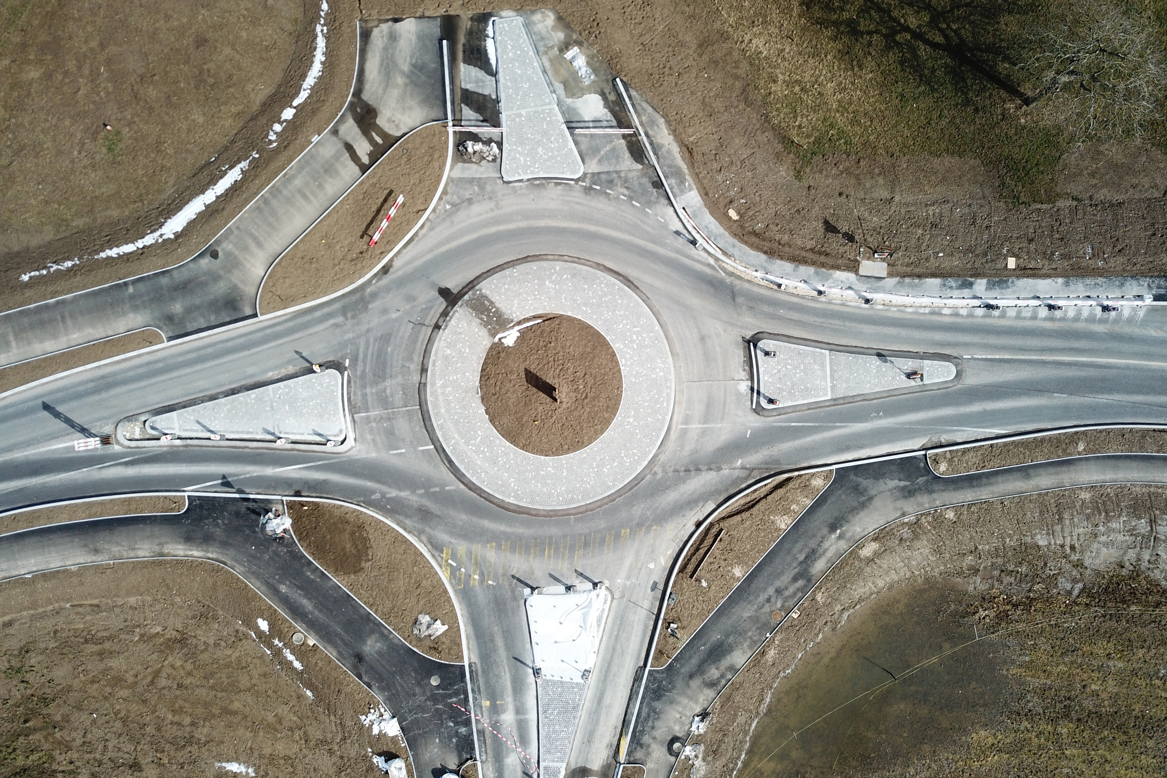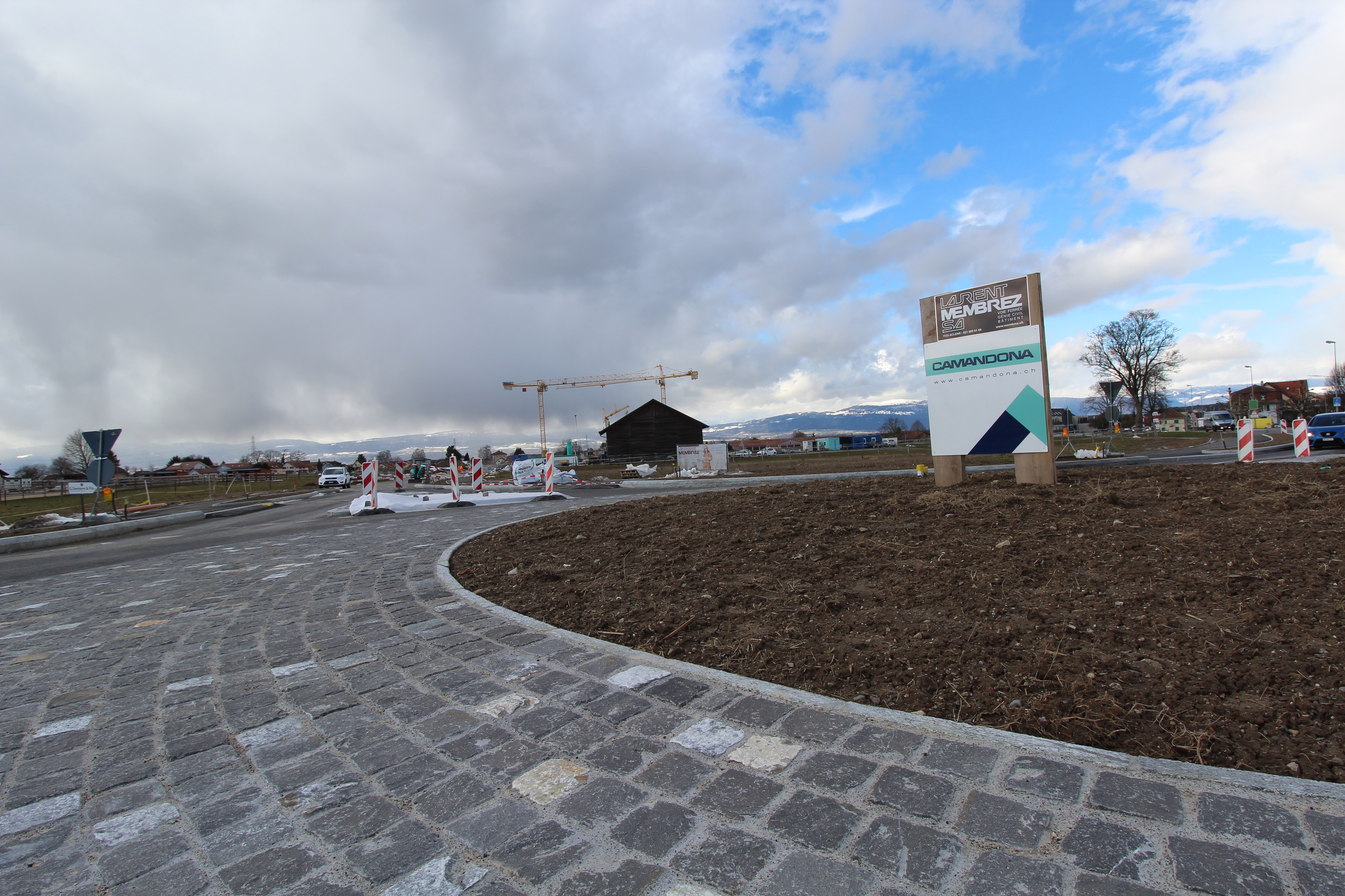 Terrassement : En plein champs - gestion des horizons Amélioration sol : Stabilisation mélange chaux / ciment Pose de collecteurs et autres services Pose de bordures et pavés granit Gestion du trafic Lausanne / Echallens Pose de revêtements bitumineux