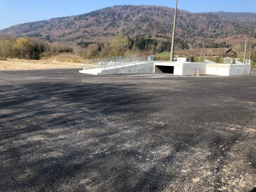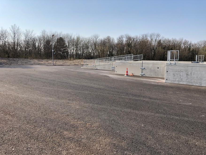 Réalisation d'une plateforme en grave GNT 0/45 Pose de tubes PE pour l'alimentation électrique Fouille pour collecteur EU Mise en place d'un récupérateur de graisse, de jus et de traitement des eaux Dallage en béton armé et mise en place d'éléments préfabriqués Pose de revêtement bitumineux Pose et réglage de plateforme en trois dimensions