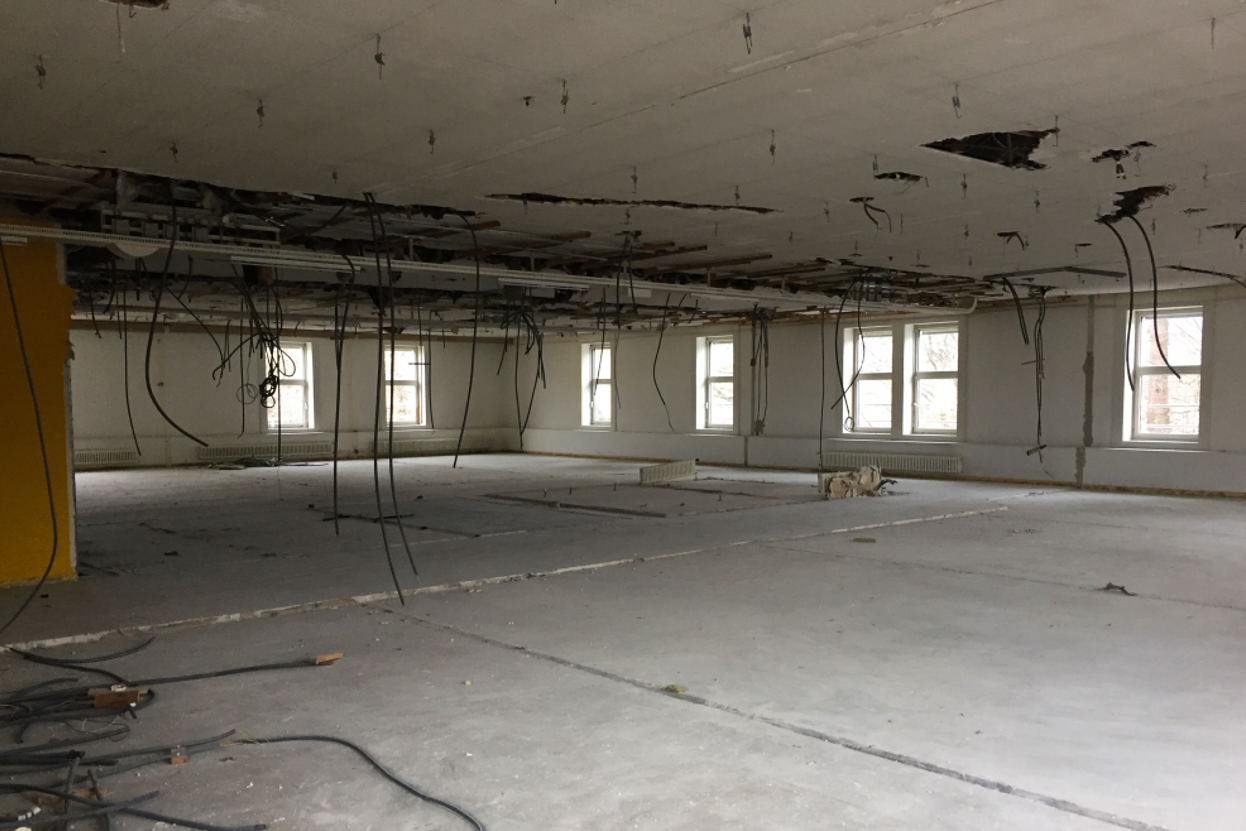 Travaux de démolition des cloisons existantes, d’enlèvement de revêtement de sol et de murs, de faux-plafonds, adaptations de divers murs existants, adaptation ponctuelle de dalles et murs en fonction des exigences de compartimentage feu. Adaptation du hall du rez pour la création d’un escalier de quelques marches et d’une plate-forme élévatrice. Adaptation de canalisations aux nouveaux points de chute des colonnes d’eau usées.